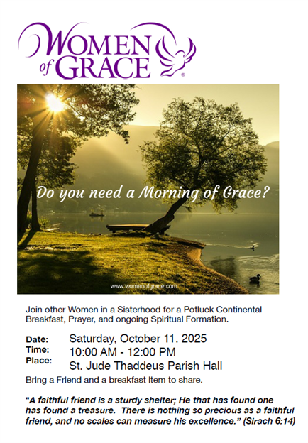 Come and connect with other widows and widowers at St Jude Thaddeus Catholic Church. It is a place where you meet others who are coping with the loss of a loved one. We will meet every Friday at 9:00 am in Room 6 of the Parish Hall.