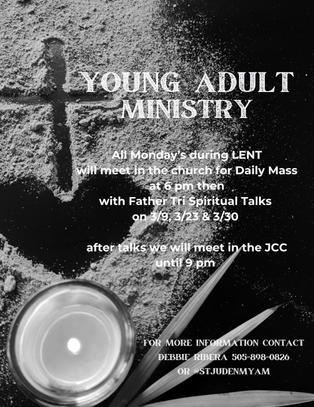 Contact Debbie Ribera, Young Adult Ministry lead at the e-mail below or by calling 505-898-0826.